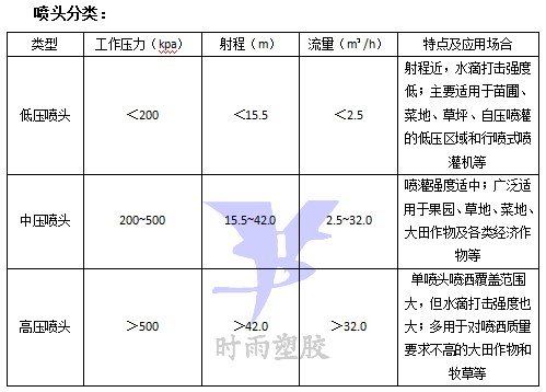 臂式喷头分为水平摇臂式喷头和垂直摇臂式喷头。摇臂沿水平方向旋转,故称为水平摇臂式喷头。水平摇臂式喷头按材质分为金属摇臂式喷头和塑料摇臂式喷头,水平摇臂式喷头的主要优点是结构简单,价格较低;喷洒水量分布可借助改变摇臂撞击频率、加设副喷嘴和粉碎针、采用异性喷嘴等进行调整;喷灌质量较高。其缺点是当风速较大或喷头回转面不水平时,旋转速度不均匀,会降低喷灌均匀度。另外,由于水平摇臂式喷头的旋转是由摇臂撞击驱动的,所以对相应零部件的耐冲击性要求较高。